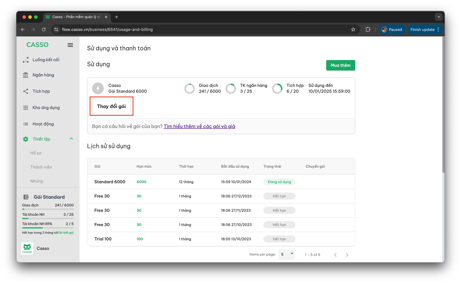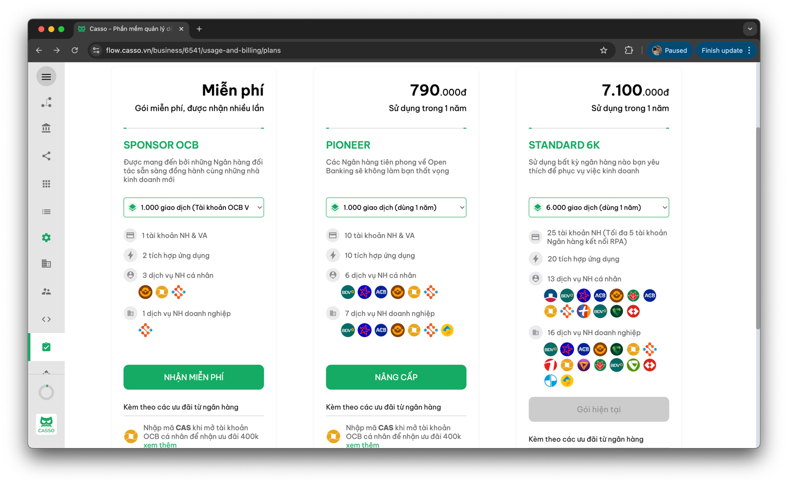 Bước 3: Sau khi chọn Thay đổi gói, giao diện bảng giá Casso sẽ hiện lên => Chọn gói và số lượng giao dịch phù hợp với nhu cầu sử dụng => Nâng cấp.